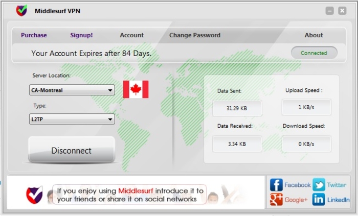 Middlesurf VPN je program, který dokáže rychle změnit IP na vámi volitelnou jinou zemi. Díky tomu si můžete prohlížet stránky, které jsou jinak zablokované. Využívá VPN protokoly PPTP / L2TP / IPSEC a podporovány jsou zařízení Android, iPhone, iPad, Windows či Mac OSX. Současně je možné připojit 1 účet až na 5 zařízení.