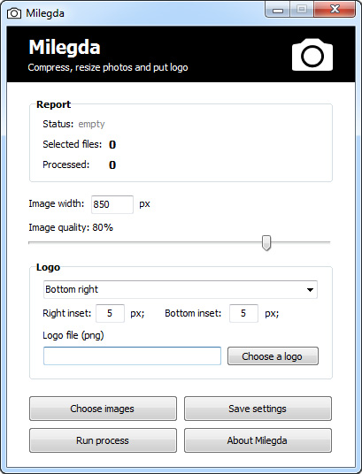 Milegda je aplikace, určená k optimalizaci JPEG obrázků. Dokáže upravit velikost obrázků v pixelech a aplikovat loga nebo štítky. Komprese obrazu může výrazně snížit fyzickou velikost souboru a tím ulehčit další sdílení obrázků. Použitím vodoznaku zaručí ochranu obrázků.