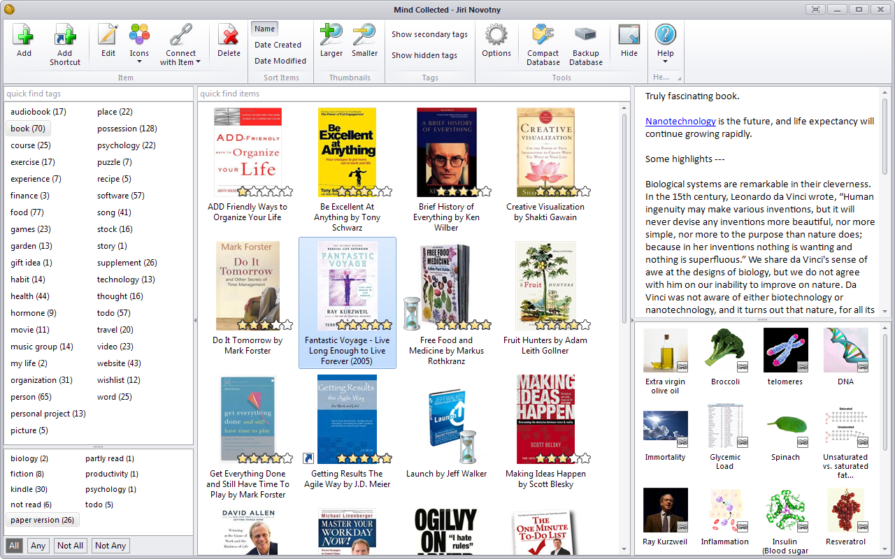 Mind Collected je osobní, vizuální databáze organizována pomocí značek. Databáze slouží k ukládání všeho důležitého, co vás zajímá a co potřebujete k práci tzv. katalog nápadů. Každý objekt v databázi má obrázek, jméno, značku, poznámku a kontakt. Nástroj může automaticky vyhledávat a stahovat obrázky pro vaše objekty z internetu, nebo můžete použít své vlastní fotografie.