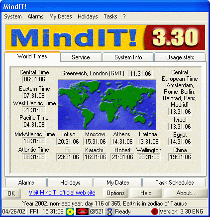 MindIT! je program bohatý na funkce. Hlavní je ovšem 10 nastavitelných budíků (mohou se také pravidelně opakovat), nastavitelné úkoly, důležitá data, atd.