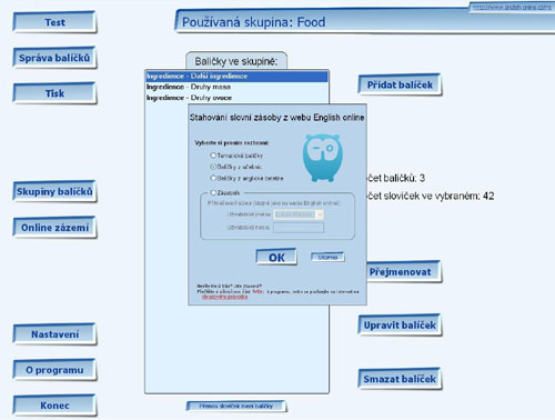 Slovní zásobu si přidáváte buď ručně, nebo ji získáváte již předpřipravenou ze serveru English-online.cz (tematické balíčky, balíčky z učebnic, slovní zásoba z anglické beletrie, služba Zásobník)