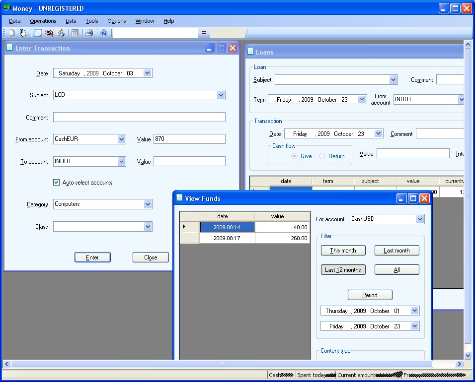 Money je velmi výkonný a na funkce bohatý osobní manažer financí pro lidi, kteří chtějí znát zdroj a cíl každého centu ... Money je plně funkční, bez jakéhokoliv omezení ve zkušební době. Ve zkušebním období tam budou nějaké registrační připomenutí. Údaje, které zadáte v databázi nejsou ovlivněny zkušebním / registrovaným režimem.