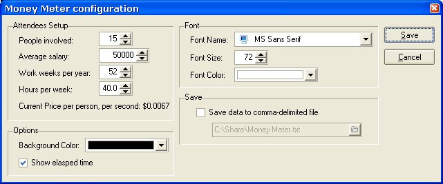 Money Meter je jednoduchý nástroj, který byl inspirován nesčetnými zbytečnými firemními schůzkami a nejlépe se používá právě k tomuto účelu. Spusťte Money Meter a sledujte průměrné výdaje zaměstnanců za sekundu v daném časovém období.
