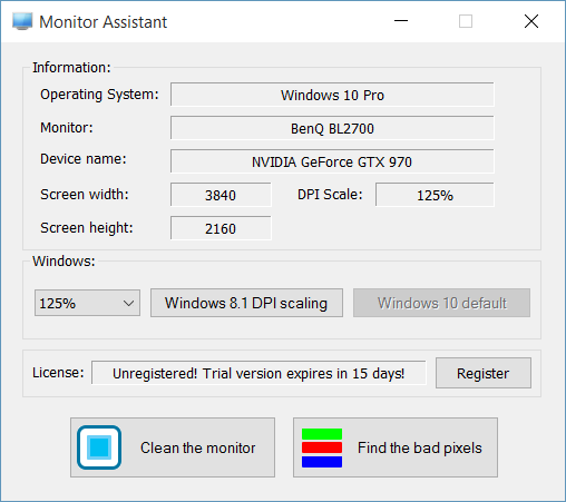 Monitor Assistant je nástroj, který detekuje špatné pixely na monitoru a zároveň umí snadno vyřešit problém s DPI. K dispozici je dvojce tlačítek. První tlačítko umožňuje přepnout do nastavení škálování DPI převzatého ze starší verze systému - Windows 8.1, druhé tlačítko umožňuje přepnutí zpět na výchozí nastavení škálování DPI (typické pro Windows 10).