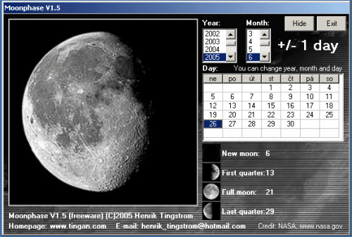 Program Moonphase zobrazuje aktuální fázi Měsíce a informuje o tom, kdy bude/byl nejbližší nov a úplněk. Uživatel má k dispozici kalendář, podle kterého může zjiš?ovat fáze Měsíce i několik let dopředu.