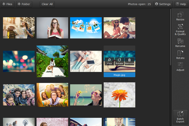 Movavi Photo Batch je program, který dokáže zpracovat velké množství obrázků a fotografií. Umožňuje hromadný převod mezi souborovými formáty, změnu rozměrů, modifikaci názvů podle předdefinovaného vzoru, rotování snímků, vylepšení pomocí automatického nástroje, případně prostřednictvím funkce pro vyvážení bílé barvy. Mezi podporované formáty patří BMP, DPX, EXR, GIF (nikoli animovaný), JPEG, JPEG 2000, JPEG-LS, PAM, PBM, PCX, PGM, PGMYUV, PIC, PIX, PNG, PPM, PTX, Sun Rasterfile, TARGA, TIFF, WebP, XBM, XFace, XWD.