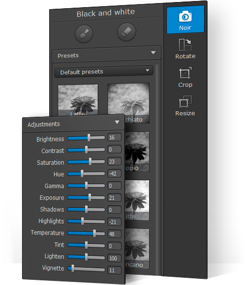 Movavi Photo Noir dodá Vašim snímkům kouzlo černobílé fotografie. Je to nejmodernější řešení pro tvorbu ohromujících černobílých obrázků z barevných fotografií. Přízpůsobením filtrů si vytvoříte své vlastní unikátní monochromatické snímky.