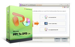 Moyea PPT to DVD Burner Lite je jednoduchý program pro vypalování PowerPoint prezentací (PPT, PPS, POT, PPTX,...) na DVD. Podporuje také převod PowerPoint do populárních video souborů: AVI, MPEG, FLV, 3GP, MP4, VOB, WMV, MOV, atd. Možnost nastavení výstupních parametrů videa.