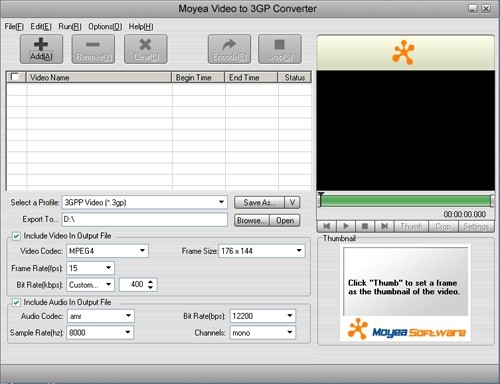 Moyea Video to 3GP Converter umožňuje konvertování video souborů do 3GP formátu, který je přehrávatelný mobilními telefony. Podporuje tyto soubory: AVI, MPEG, MPG, WMV, MOV, RM, RMVB, MP4, DV a DIF pro převod do 3GPP/3GPP2. Moyea Video to 3GP Converter podporuje rychlý a jednoduchý převod pomocí hromadnému zpracování souborů.