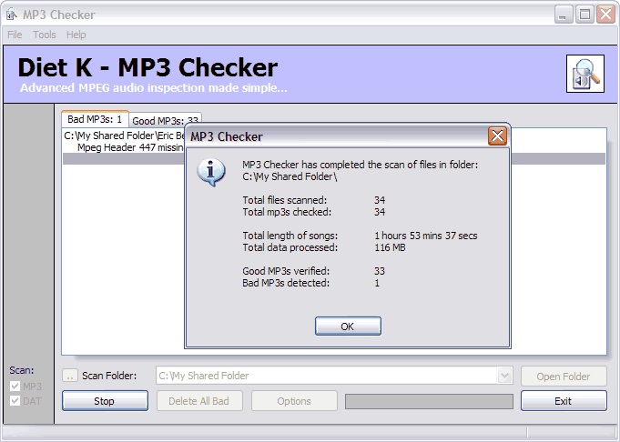 MP3 Checker je snadno použitelný nástroj, který rychle skenuje MP3 pro všechny typy poškození. MP3 Checker používá tři nezávislé metody odhalení všech druhů různých falešných mp3.