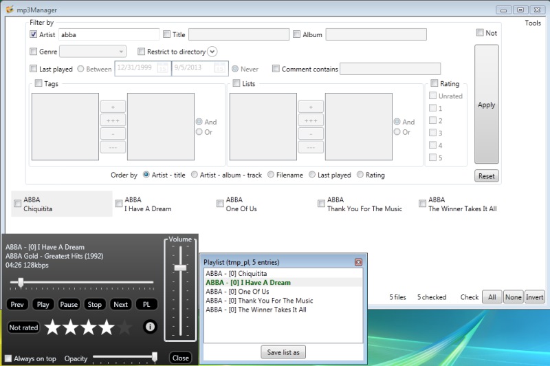 mp3Manager je aplikace, která slouží jako správce Vaší mp3 hudební sbírky. Při prvním spuštění se Vás zeptá na Vaše cesty k hudebním adresářům, počínaje výchozích systémových složek (tyto oblasti mohou být později změněny). mp3Manager automaticky nebo na požádání začne tyto nadefinované složky skenovat, následně Vám zobrazí podrobné informace o všech mp3 souborech v databázi. Hlavní okno umožňuje vypsat všechny soubory a filtrovat je podle různých kategorií. Jedním ze základních rysů mp3Manager je vytvoření a udržování seznamů. Hudební seznamy můžete používat interně v aplikaci, exportovat je do Winampu nebo kopírovat vybrané soubory do cílového adresáře. Další velmi důležitou vlastností je možnost hodnotit soubory a používat tyto ratingy později k filtrování a řazení.