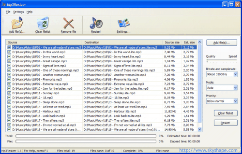 MP3resizer dokáže zmenšit velikost MP3 souboru skoro až o 1/3 a to zredukováním kvality. Tento program využijí hlavně majitelé mobilních telefonů podporujících MP3. Ovládání je velice jednoduché - vyberete MP3 soubory, vlastnosti jako bitrate a samplerate a stisknte tlačítko resize.