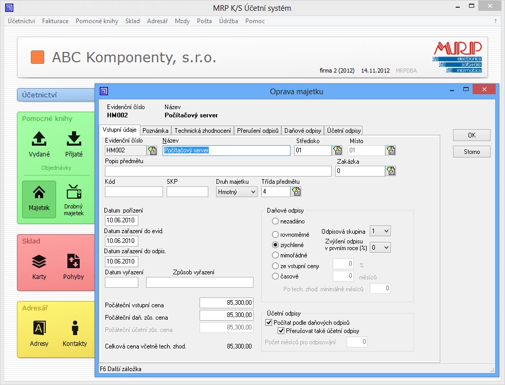 MRP-K/S - Účetní systém je vlajková loď účetních programů MRP! Ucelený účetně-informační systém, který posouvá hranici dokonalosti a vytváří tak nové měřítko kvality v oblasti účetních systémů. MRP-K/S v sobě spojuje na jedné straně mohutný nástroj pracující s maximální precizností a spolehlivostí (díky použité technologii Klient/Server) a na druhé straně si udržuje jednoduchost a ladnost ovládání, flexibilitu k měnící se legislativě a intuici k rostoucím potřebám uživatelů. Snahou tvůrců tohoto systému bylo vytvořit dílo, které by v maximálně možné míře dokázalo povznést a nadchnout obsluhující personál i při takové (na první pohled nezajímavé) činnosti, jakou je zpracování dat účetních agend.