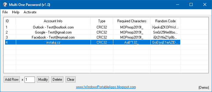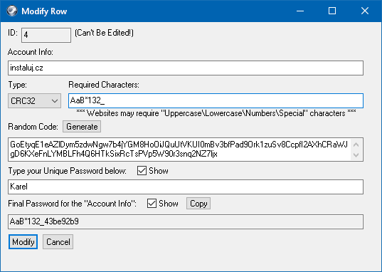 Multi One Password generuje bezpečná hesla pro vaše účty na internetu dle zadaných podmínek. Funguje to tak že ke každému generovanému heslu je možné vytvořit určitý prefix v kolonce "Required characters" tak aby splňovaly podmínky např. malé a velké písmeno, číslo a znak. Následně si zvolíte nějaké vaše heslo, může být klidně jednoduché, to vložíte do kolonky "Unique password" a ve spodním řádku "Final password" se vám zobrazí vygenerované bezpečné heslo na základně Random code, heslo je tak unikátní pro každý účet a vy si jej nemusíte pamatovat, kdykoli jej pak vyvoláte zpět zadáním vašeho jednoduchého hesla.