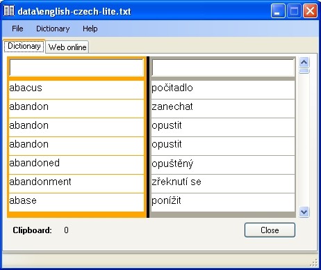 Program používá lokální databáze i online slovník. Oboustranný slovník pracuje s databázemi v kódování UTF-8. Vložením textu do jednoho z horních editů dojde k automatickému vyhledání slovíčka ve slovníku. Kliknutím na určitý edit s odpovídajícím překladem, se vloží tento do schránky. Změnu databáze provádíme z menu "Dictionary->english-czech-lite.txt" atd.