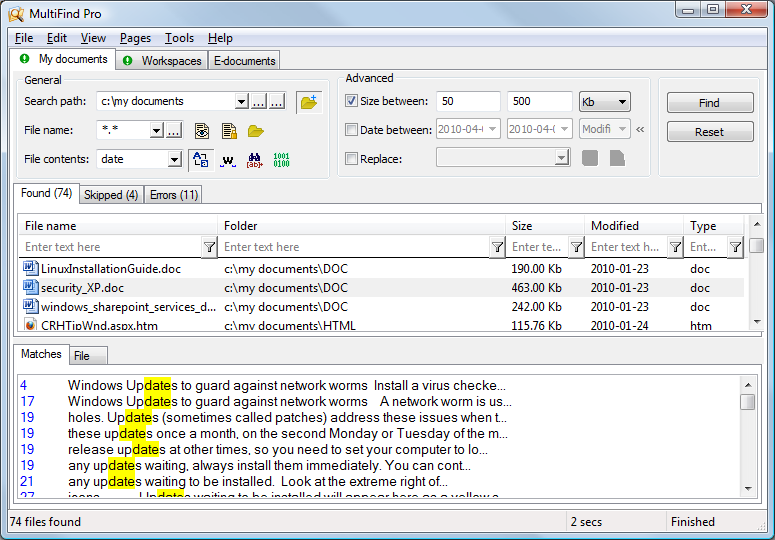 Multifind Pro je pokročilý nástroj na vyhledávání souborů. Umožňuje vyhledávání podle textového řetězce, regulérních výrazů, velikosti souborů, datumu atd. Je podporováno mnoho formátů souborů: DOC, XLS, PPT, PDF, HTML, RTF. Nalezené textové řetězce jsou označeny v obsahu souboru.