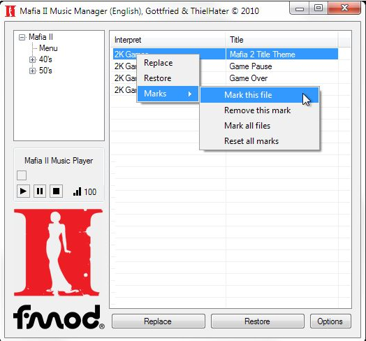 Music Manager čeština přeloží do češtiny jednoduchý prográmek, se kterým můžete měnit hudbu v Mafii 2 za svou vlastní (podporované formáty: FLAC, MP2, MP3, OGG, WAV a WMA).