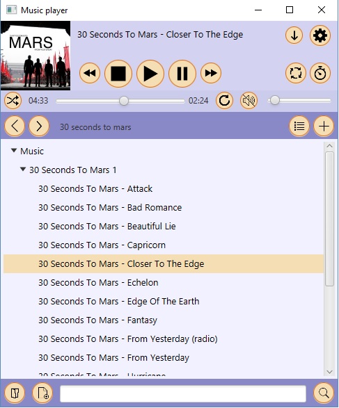 Music-Player je jednoduchý hudební přehrávač. Můžete v něm vytvářet playlisty, které můžete dodatečně upravovat, míchat skladby, použít časovače pro automatické ukončení přehrávání v předem nastavený čas. A mnoho jiných vychytávek. Aplikace má jednoduché grafické prostředí.