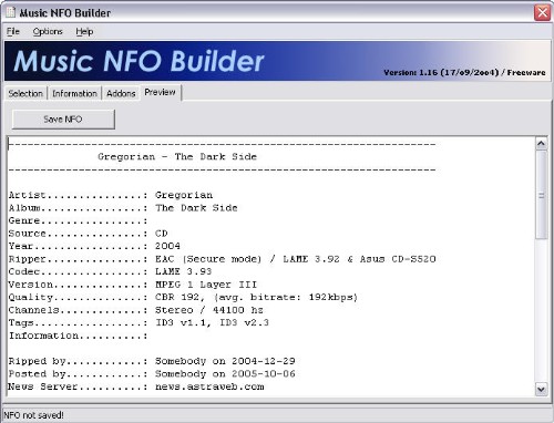 Načtené informace umí program vygenerovat jako *.nfo soubor a k tomu vám může vytvořit playlist a soubor s kontrolním součtem.