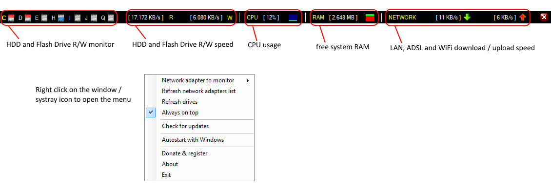 My System Monitor je chytrý nástroj, který je umístěn v horní části pracovní plochy a poskytuje dokonalý přehled využití hardwarových prostředků. Zobrazení rychlosti čtení a zápisu USB flash disku i využití jednotlivých diskových oddílů, stejně tak i monitoring využití CPU a RAM paměti, rychlost stahování a nahrávání (LAN, ADSL, WiFi) je samozřejmostí.
