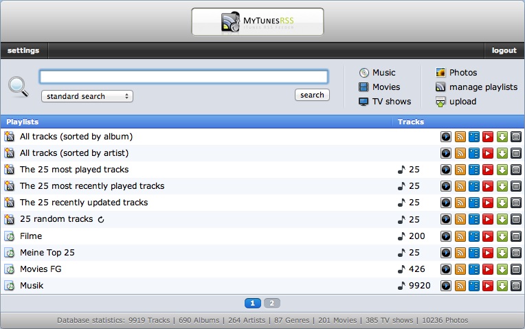 MyTunesRSS Server je Váš osobní mediální server. Neplaťte za ukládání hudby, filmů, televizních pořadů a fotografií v nějakém úložišti typu cloud. Přístup k médiím z kteréhokoli místa na světě, u jiných internetových počítačů nebo mobilním zařízení. Vše, co potřebujete, je webový prohlížeč. Samozřejmě jej můžete také jednoduše použít doma, bez přístupu k internetu ve Vaší síti.