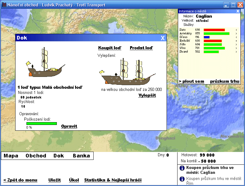 Stáhnout zdarmaVlastníte námořní dopravní společnost a plujete z jednoho města do druhého. Nakupujete, prodáváte a snažíte se co nejdříve splnit cíl mise. Postupem hry zvětšujete svůj počet lodí, přecházíte z malých lodiček na galeony. Po cestě Vás můžou přepadnout piráti a bojujete ve střeleckém souboji o svůj náklad. Každá cesta přináší své riziko.