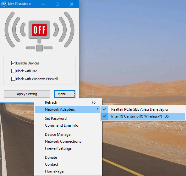 Pokud máte v počítači nainstalováno více síťových adaptérů, můžete Net Disabler použít k zablokování všech nebo jen jednoho z nich.