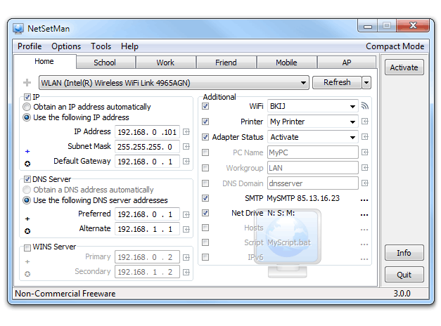 NetSetMan je manažer síťového připojení, který umí snadno vytvořit a přepínat mezi šesti různými, vizuálně strukturovanými profily, včetně nastavení:
