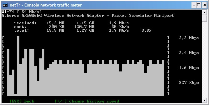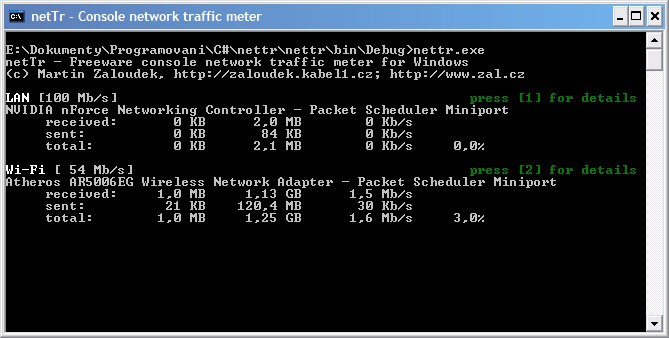 Program netTr poskytuje informace o síťovém provozu. Je to příkazová řádková aplikace, která zobrazuje aktuální rychlost přenosu dat, celková přenesená data a historii vytížení všech síťových rozhraní počítače. Je vhodný pro administrátory, kteří potřebují mít informace o síťovém provozu rychle a snadno k dispozici.