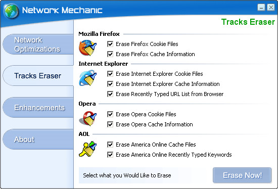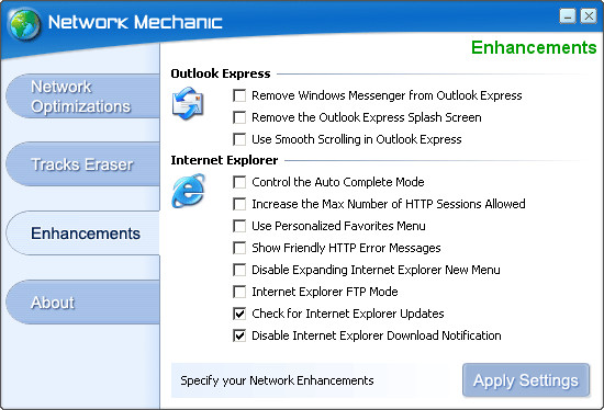 • Internet Explorer a Outlook Express - Network Mechanic optimalizuje nastavení těchto aplikací tak, aby bylo dosaženo maximální rychlosti jejich provozu.