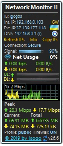 Network Monitor II je bezplatná miniaplikace, která slouží jako indikátor stavu vašeho internetového připojení. Umožňuje sledovat různé aspekty vašeho připojení, včetně rychlosti odesílání a přijímání dat, objemu odeslaného a staženého datového toku, informací o síle a zdroji vašeho Wi-Fi připojení, interních a externích IP adres (včetně vlajek zemí), údajů o bráně (Gateway) a DNS – to vše přehledně zobrazené na ploše.