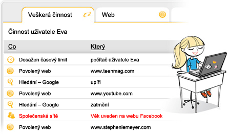 Děti tráví na Internetu v průměru 40 hodin měsíčně. Abyste jim mohli nabídnout stejnou úroveň rodičovské ochrany jako v jiných oblastech života, potřebujete vědět, jak svůj čas online tráví. Aplikace Norton Online Family vám poskytne přehled o tom, jaké stránky děti navštěvují a co dělají online. Díky tomu jim můžete zajistit ochranu a učit je zásadám práce s Internetem.