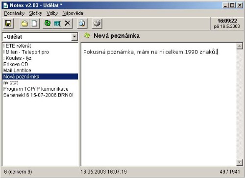 Jedná se o jednoduchý nástroj pro správu vašich poznámek nebo zápisek. Pro přehlednost se poznámky umisťují do složek, které si můžete libovolně vytvářet. Program disponuje kromě možnosti tisku také funkcí hledání v poznámkách, ve složce nebo ve všech oblastech. Notex je uzpůsoben především k možnosti jeho okamžitého použití - stačí jej spustit, stisknout tlačítko Nová poznámka (nebo CTRL+N) a můžete psát. Rozepsanou poznámku pak lze uložit příslušným tlačítkem (nebo CTRL+S), aniž by bylo nutné zdržovat se vymýšlením jejího vhodného názvu. Upozorňuji, že název složky nebo poznámky může být dlouhý maximálně 32 znaků, vkládaný text je pak omezen na 1990 znaků (pokud by vám to nestačilo, napište mi a já se pokusím toto maximum zvednout). Název složky navíc nesmí obsahovat znaky / \ : * ? " < > |