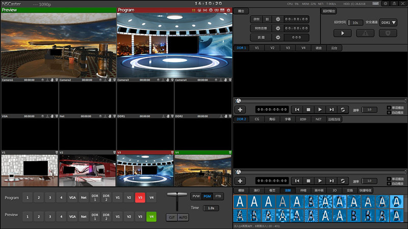 NSCaster je výkonný software, který přináší mnoho výkonných funkcí k vysílání a streamování videí. Obsahuje spoustu funkcí včetně 3D virtuální scény, možnosti přepínání vstupních kanálů, nahrávání, vysílání, použití audio mixeru, funkce zpoždění vysílání, živé streamování až ze čtyř kamer, vše s využitím SDI / HD-SDI / 3G-SDI konfigurací a jednoho webového video zdroje atd.