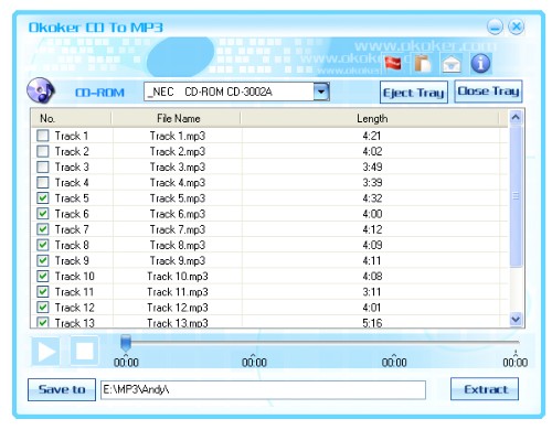 Program Okoker CD to Mp3 umožňuje jednoduše extrahovat audio stopy z vašeho CD a uložit je do Mp3 formátu. Program ripuje ve vysoké rychlosti se zachováním kvality. Okoker CD to Mp3 má jednoduché ovládání a příjemný vzhled.