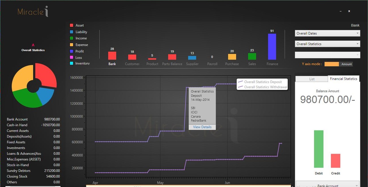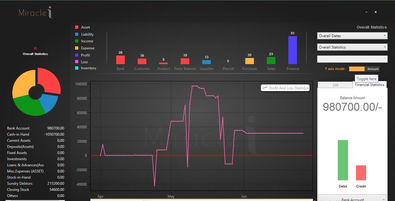 OpenMiracle je výkoný program, který Vám pomáhá v grafickém znázornění stavu společnosti. Unikátní software s unikátními vlastnostmi jako první na trhu. Miracle irepresents je modul openmiracle pro promítnutí různých grafických prezentací z většinou idealistického pohledu. Účetní uzávěrka může být snadno analyzována pomocí pie-grafu, uživatelské rozhraní je nyní pružnější s pomocí barev a barev grafového hodnocení. Miracle Skate pomáhá přenést data z Tally účetního software k otevření Miracle bez ztráty dat a pomáhá zákazníkům, aby si vyzkoušeli funkce nejnovějšího firemního účetního zázraku.