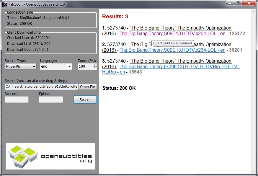 Opensubtitles Search je malý přenosný vyhledávací klient pro server Opensubtitles, který vyhledává a stahuje filmové titulky. Stačí zvolit název filmu či seriálu. Samozřejmě je možné přidat jazyk titulků (například v angličtině, češtině) a také zoom, neboli zvětšení titulků ve vyhrazeném prostoru. K titulkům jde přidat i samotný video soubor, který je uložený na lokálním disku.