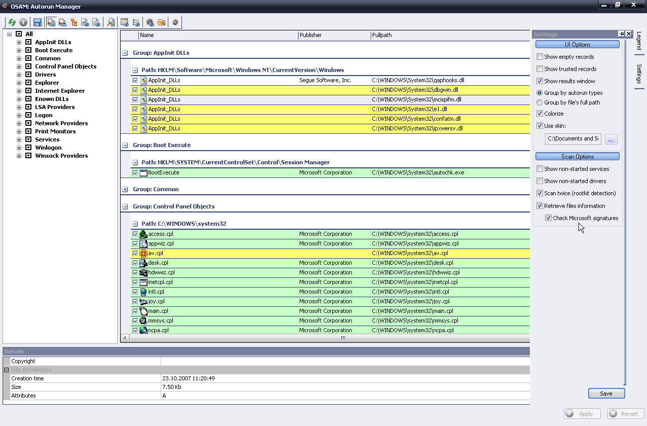 OSAM: Autorun Manager vám zobrazí následující informace o každém objektu:
