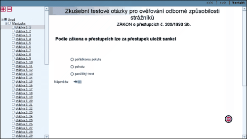 V levé části jsou ve stromové struktuře rozepsány jednotlivé okruhy otázek. Ústava ČR,obecní policie, Obce, kraje, Právo shromaždovací, Policie ČR, Zbraně, Přestupky, doprava a odpady.Výběrem složky se dostaneme k jednotlivým otázkám, které se zobrazují v pravé části obrazovky.