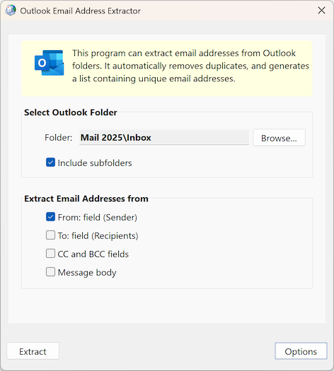 Outlook Email Extractor je užitečný nástroj pro extrahování emailových adres a jmen z vašich Outlook emailů (poštovní složky). Načte všechny platné emailové adresy a automaticky odstraní duplikáty.
