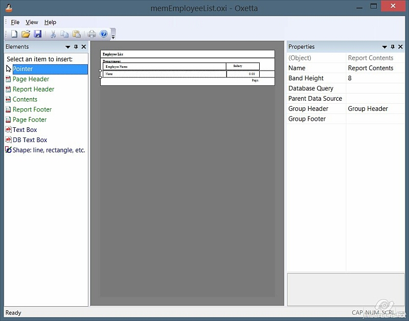 Oxetta je výkonné řešení pro vytváření zpráv, primárně určený pro vývojáře. Slouží také jako generátor reportů. K dispozici je možnost změny vlastností objektů, přizpůsobení orientace stránky, velikosti i titulku. Lze také přepínat mezi SQLite a OBDC databázemi.