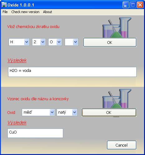 Program pro zjištění názvu oxidu, nebo chemické zkratky - betaverze. V horní polovině aplikace se nacházejí čtyři comboboxy pomoci nichž vytvoříme chemickou zkratku vzorce. Pokud tento neobsahuje žádná čísla, druhý a čtvrtý combobox necháme prázdný jinak vybereme čísla, která jsou obsažena v comboboxech. Jiná čísla mimo tento rozsah jsou neplatná! Pak zmáčkneme tlačítko "OK" a v editu se nám vypíše "výsledek". V dolní polovině pak můžeme získat chemickou zkratku podle názvu oxidu. Z prvního comboboxu vybereme název prvku a z druhého příponu. Po zmáčknutí tlačítka "OK" se do editu vypíše výsledek, který reprezentuje chemickou zkratku zadaného oxidu.