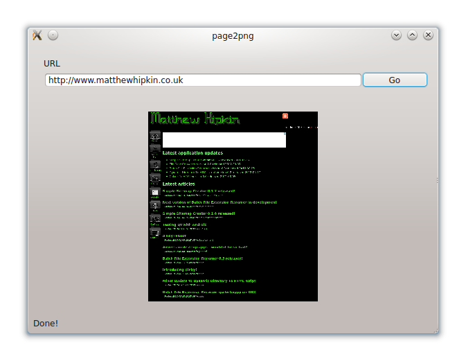page2png je malá aplikace, která slouží k vytváření screenshotů, jenž jsou následně uloženy ve formátu PNG. Nastavení je jednoduché, stačí zvolit zda má být zachycena celá stránka, nebo jen dané okno. Je zde také možnost zachycovat mobilní verze.