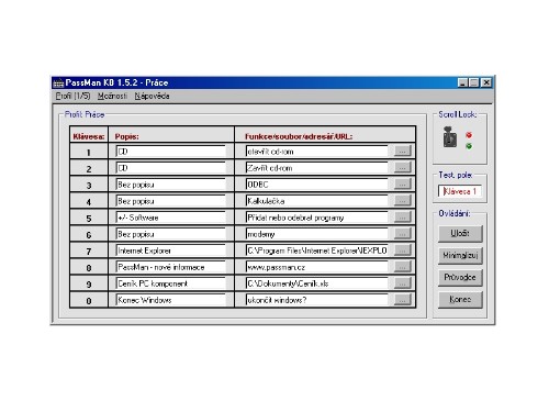 Program PassMan KB 1.5.2 (příslušenství aplikace PassMan 1.5) spolehlivě nahradí jakoukoli multimediální klávesnici. V programu si můžete nadefinovat až deset parametrů (pro každý profil), díky kterým budete moci spustit programy, soubory, vypínat počítač, otevírat adresáře a mnoho dalších funkcí stejně snadno jako na plnohodnotné multimediální klávesnici. Jestliže už tuto klávesnici vlastníte, pak s tímto programem se stane ještě rozšířenější. Stiskem klávesy Scroll Lock se aktivuje speciální mód, který je signalizován rozsvícením její kontrolky a ukazatelem přímo v programu. Když v tomto zaktivovaném módu stisknete numerickou klávesu, nadefinovaná funkce se vykoná. Oproti své předešlé verzi, pod názvem "Rychlík v1.0", je doplněn o dalších téměř 60 funkcí různého zaměření, celkem šest uživatelských profilů, dále možnost ihned si ověřit požadovanou funkci, volbu nastavení používaných číslic (na pravé či levé straně klávesnice) a také aktualizaci e-mailových adres SMS operátorů a jiné.
