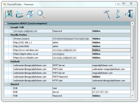 PasswdFinder je elegantní freeware utilita, která Vám pomůže najít ztracené hesla. Po instalaci se Vám zobrazí uložená hesla z webových prohlížečů, e-mailových klientů, instant messaging, FTP klientů a dalších programů. Seznam podporovaných programů najdete na stránkách výrobce.
