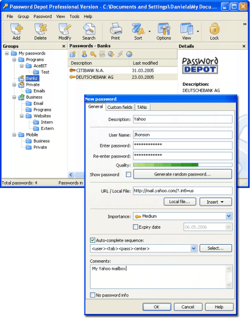 Password Depot je užitečná utilita pro ochranu vašich důležitých hesel před vnějšími přístupy. Umožňuje spolehlivé zabezpečení vašich hesel, které používáte např. při vstupu na internet, při finančních transakcích v online bance, v elektr. shopu atd. Všechna hesla, která si ukládáte jsou zašifrována algoritmy BlowFish a Rjindael pro vysokou bezpečnost. Použitím generátoru hesel program vygeneruje bezpečná hesla.