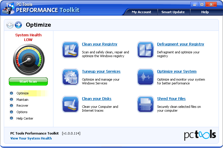 PC Tools Performance Toolkit nabízí jednoduché na použití nástroje pro zrychlení vašeho počítače, optimalizaci jeho výkonu a ochranu soukromí. Používá pokročilou technologii, která zvýší stabilitu, monitoruje systém a nastaví služby. Dále umožňuje rychlejší start systému, obnovení ztracených dat a opravu pevného disku.