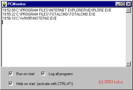 Chcete vědět kolik času tráví u počítače vaše děti a co na něm dělají? PCMonitor lze automaticky spouštět při startu, je možno zvolit i skryté (HIDE) spuštění (v tomto případě pro zobrazení PCMonitoru použijte kombinaci kláves CTRL+F1). Do souboru log.txt se zaznamenávají časy spuštění/vypnutí počítače a volitelné i spouštěné programy.