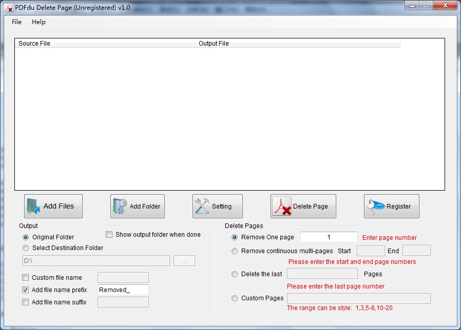 PDFdu Delete Page je rychlý a snadno použitelný nástroj, který můžete použít k odstranění jedné nebo více stránek z Vašich PDF dokumentů. Zadejte čísla stránek a klikněte na tlačítko "Delete Page". Můžete použít rozsah stránek nebo stránky v příkladu formátu "1, 3-5,". Po odstranění zbytečných stránek z PDF, můžete vytvořit nový PDF soubor.