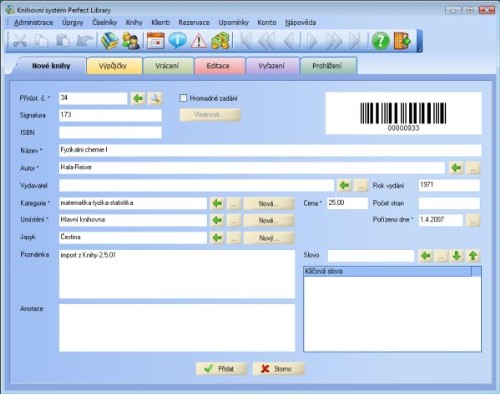 Program "Perfect Library" je moderní knihovní systém, který využije každá knihovna - jak malá tak i velká. Lze jej nasadit samozřejmě i pro evidenci domácích "knihoven", i když v tomto případě asi nebude využito všech jeho předností. Program používá databázový server PostgreSQL, pracuje tedy v síti. Podporuje čtení i tisk čárových kódů knih i klientů, umožňuje provádět rezervace knih, sledovat výpůjčky a to i na omezenou dobu, sledovat prodlené výpůjčky i tisknout upomínky a oznámení o rezervaci knih. Program dokáže tisknout mnoho sestav, protokolů, knižních i katalogizačních lístků, dokáže odesílat emaily a informovat tak klienty o připravených rezervacích a upomínkách. Program umí naimportovat Vaši stávající databázi z Excelu a také uložit veškeré sestavy jako dokument ve formátu Microsoft Excel 97-2003 i Excel 2007. Samozřejmostí je možnost importu dat z programu Knihy 2.x. Všechny tyto funkce program poskytuje ve své standardní konfiguraci, není zapotřebí dokupovat žádné zvláštní moduly pro exporty dat, síťový provoz nebo čárové kódy.